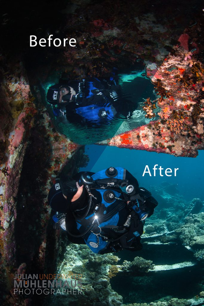 And another picture from the 2022s GUE Creative Trip with redseaexplorers. On this dive we faced a difficult current, so we found shelter in the remains of wreck. If you and your buddy work as team and keep your eyes open, you can find a lot of interesting opportunities like this air pocket in the wreck. The pictures shows, that even with proper settings and light positing minor adjustments on the pictures have to be done.